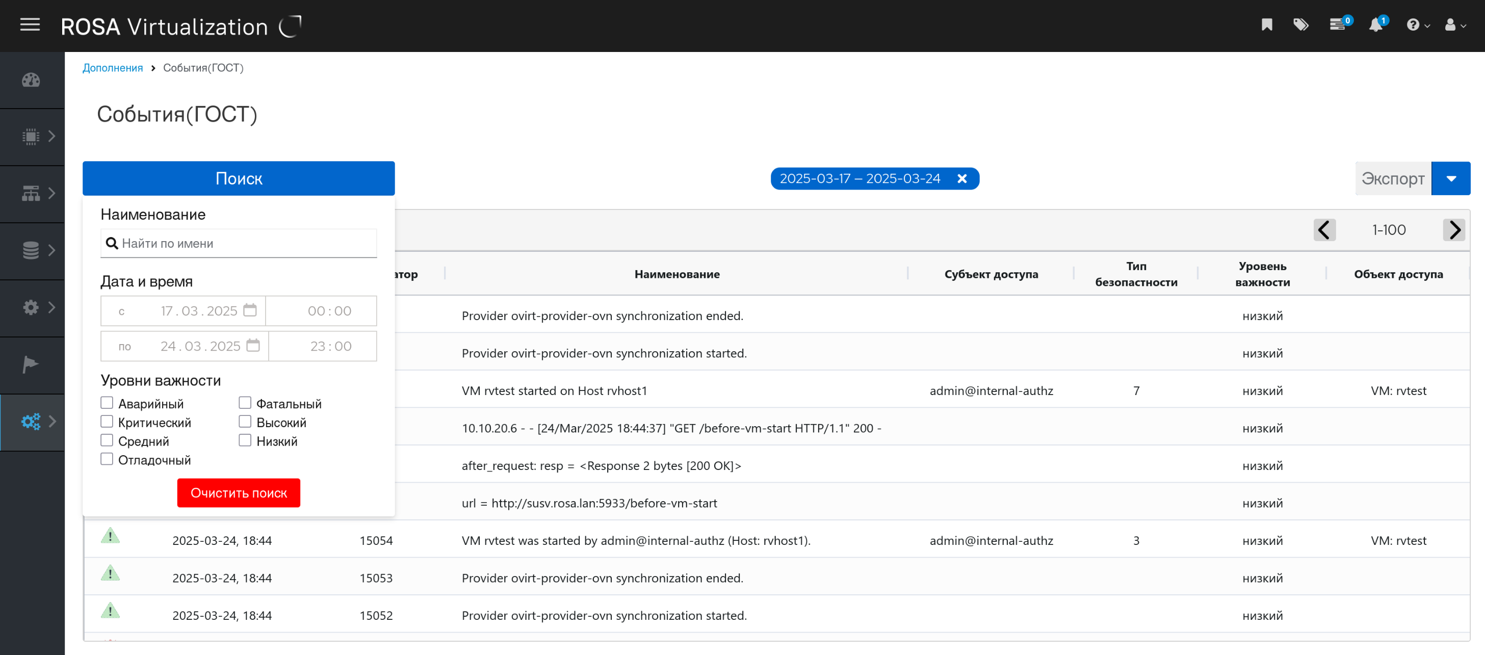 Рисунок 15 ‒ Поиск событий и фильтрация событий по дате/времени, уровню важности