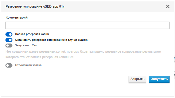 Для создания резервной копии ВМ нужно нажать кнопку Резервное копирование, расположенную в строке названия машины, в результате чего откроется окно (рисунок 14).