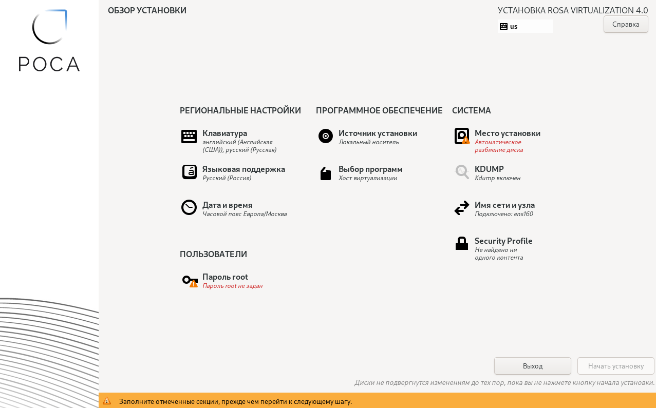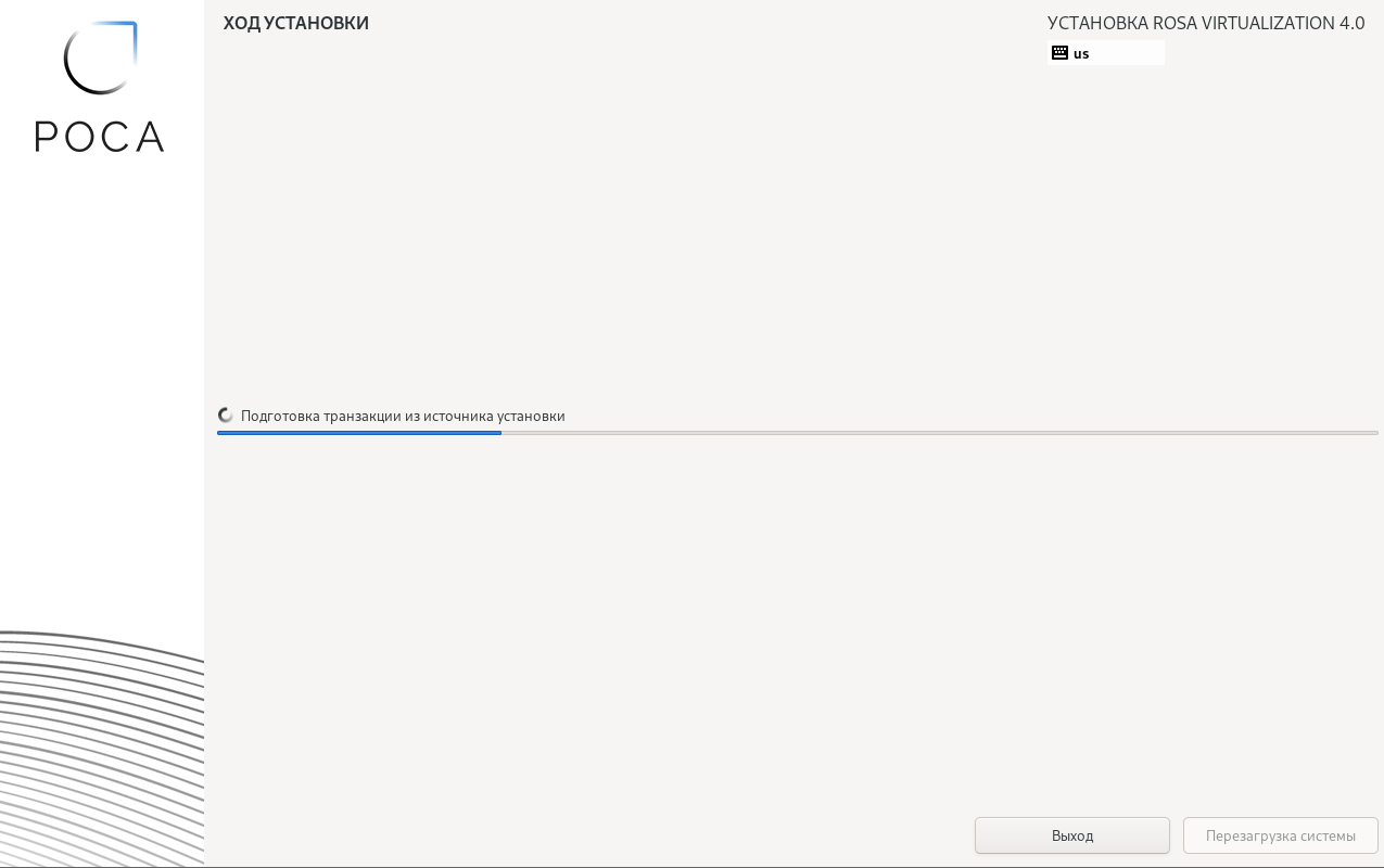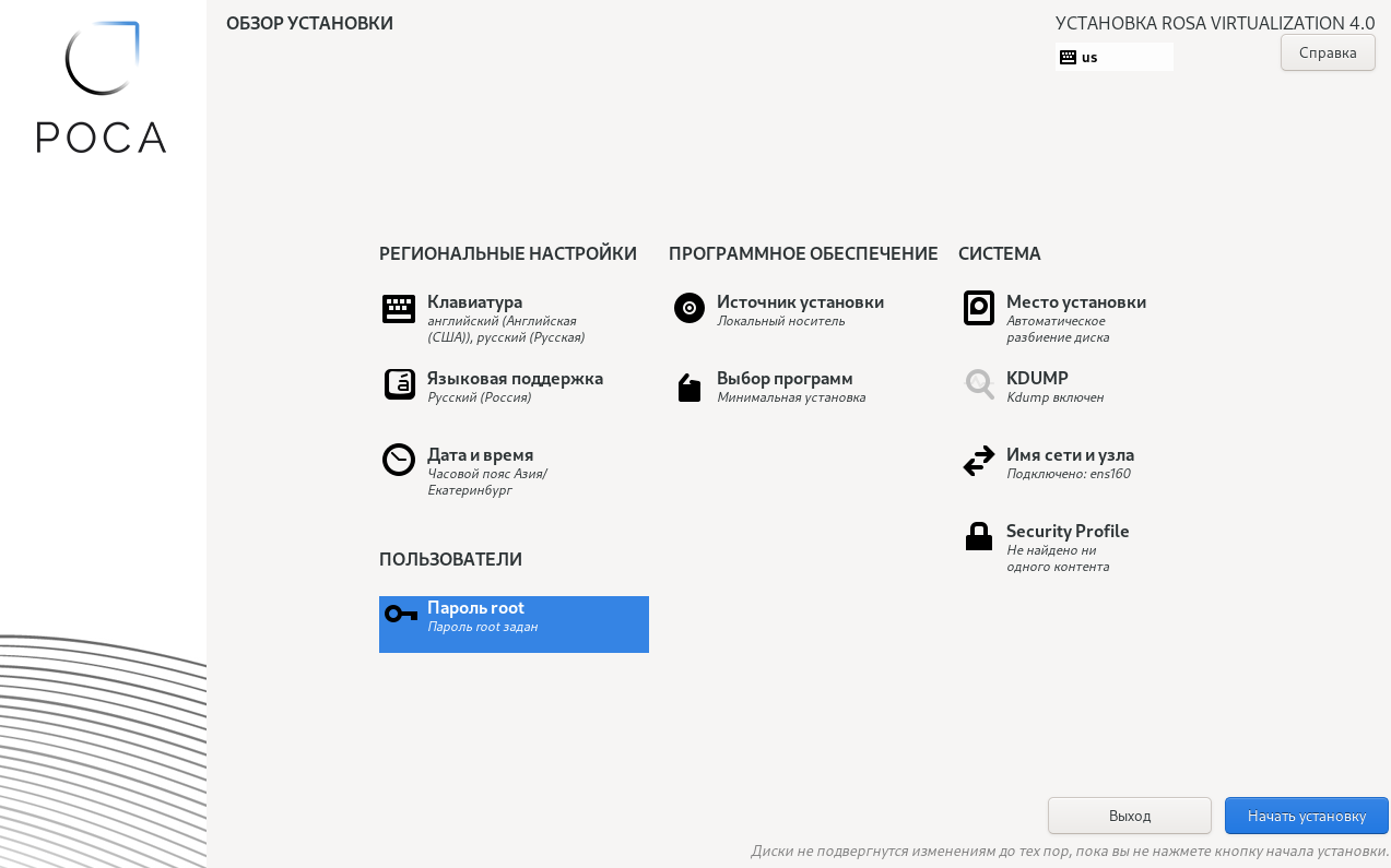 Процесс установки СУСВ аналогичен процессу установки гипервизора и использует тот же дистрибутив РОСА Виртуализация, но при установке осуществляется выбор другого набора пакетов.