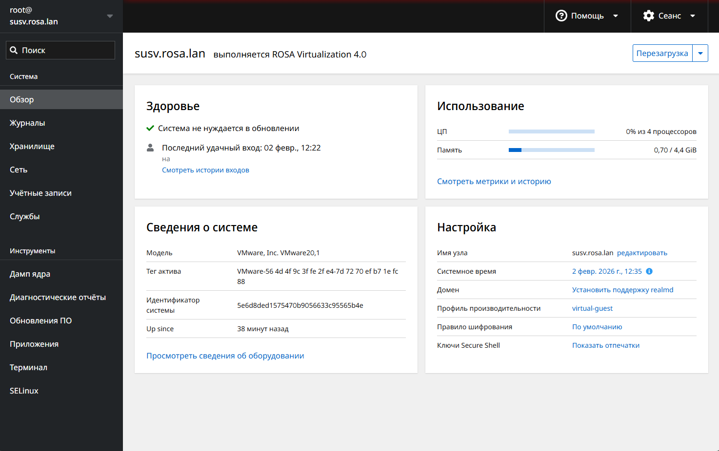 Учетная запись суперпользователя root предназначена для администрирования РОСА Виртуализация. Для учетной записи суперпользователя root крайне важно установить надежный пароль, чтобы исключить возможность несанкционированного доступа к ресурсам РОСА Виртуализация.