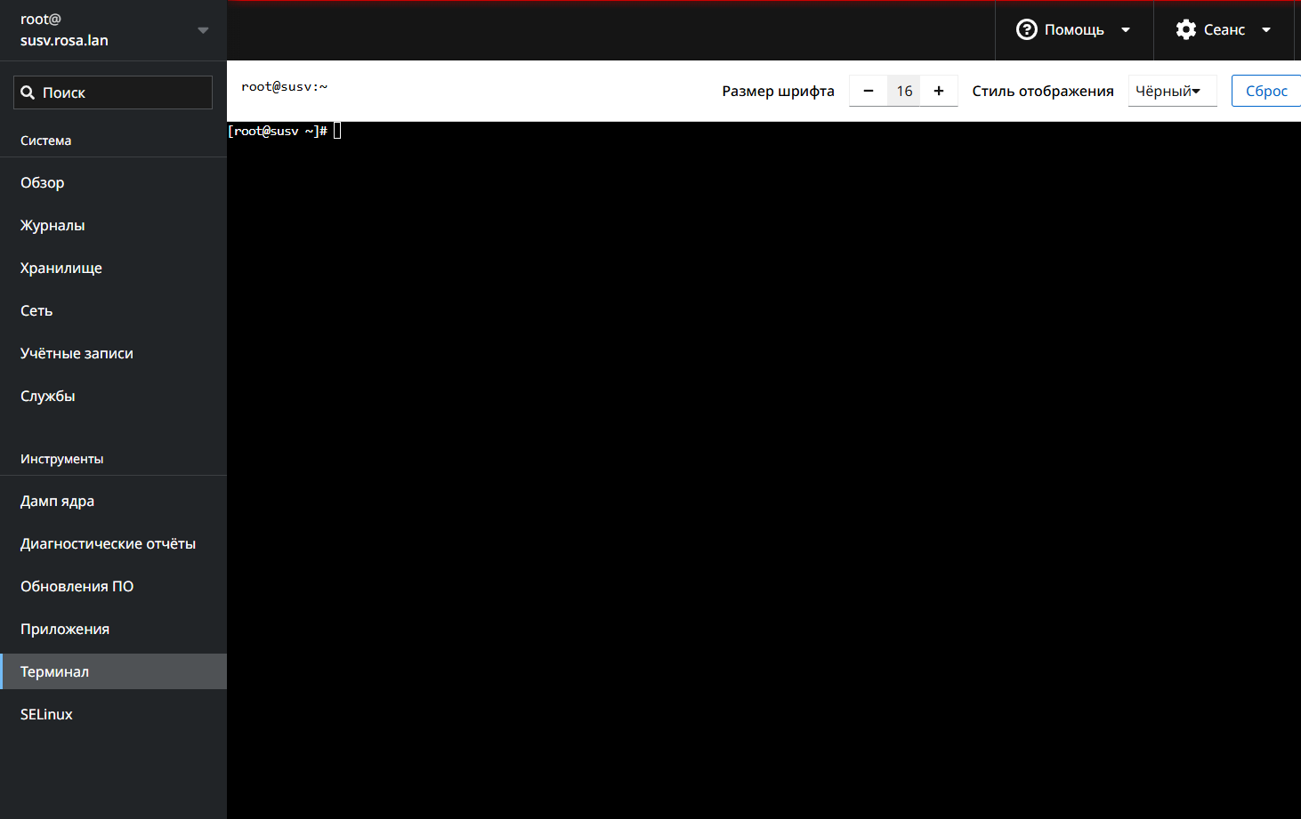 Затем можно получить терминальной доступ к системе, выбрав в левой панели меню пункт "Терминал". В окне справа откроется терминал системы (рисунок 20).