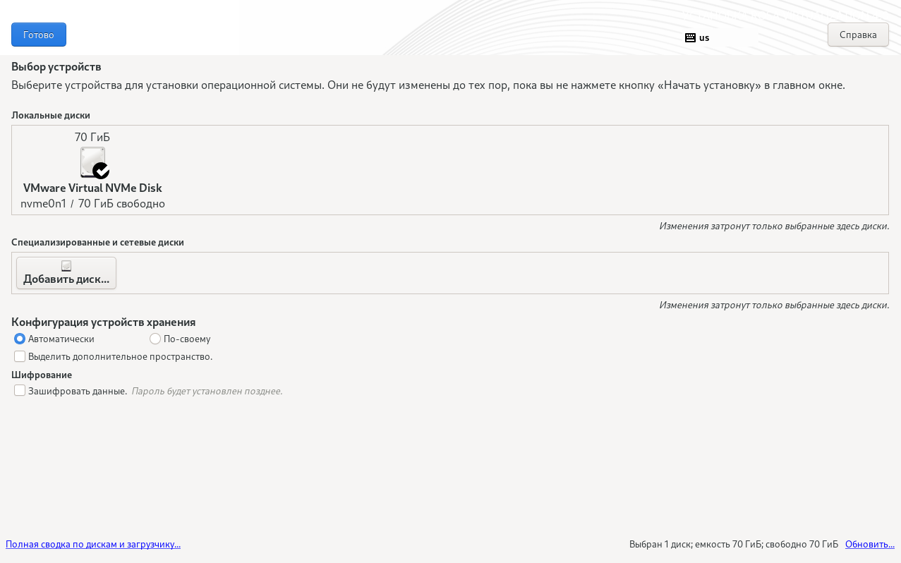 - "Место установки" – интерфейс секции предназначен для выбора диска для установки гипервизора и настройки конфигурации разделов диска в автоматическом или ручном режиме;