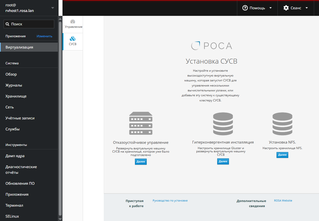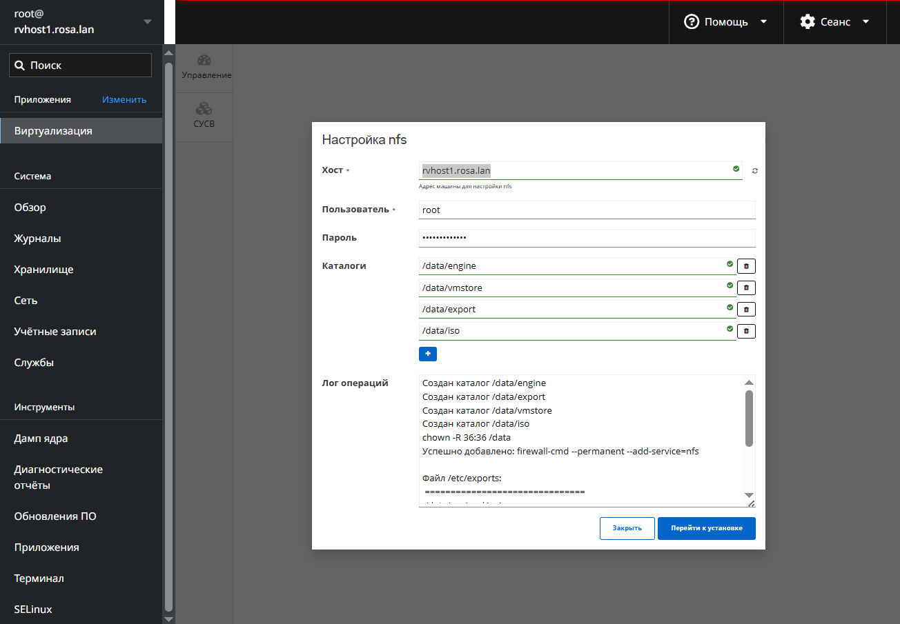 - после завершения настройки хранилища NFS можно перейти к установке СУСВ (кнопка