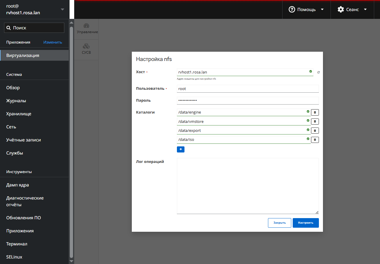 Настроить), хранилище NFS будет создано и настроено, в форму "Лог операций" будет выведен лог выполненных действий;