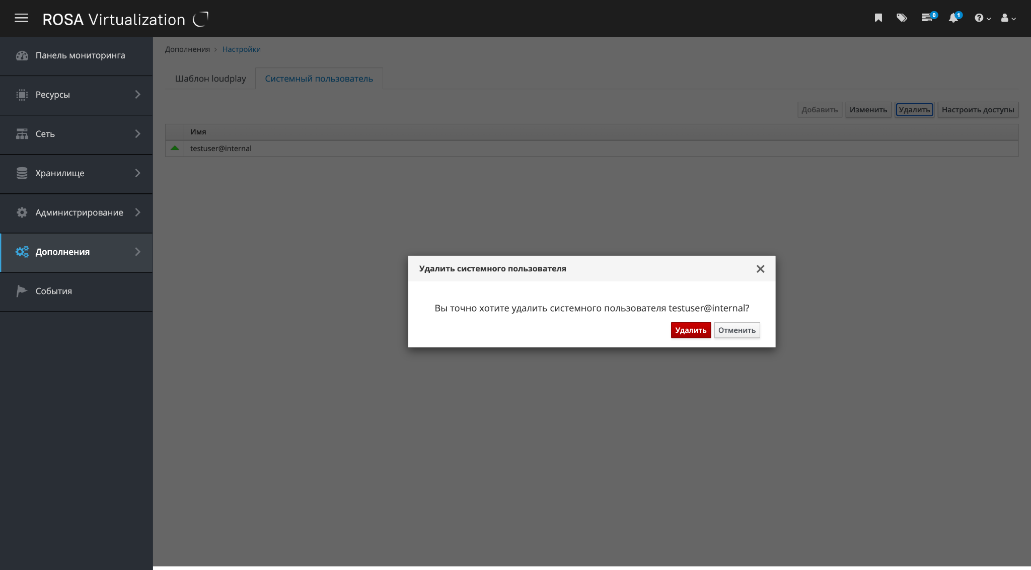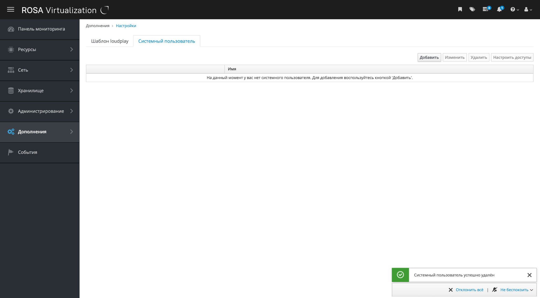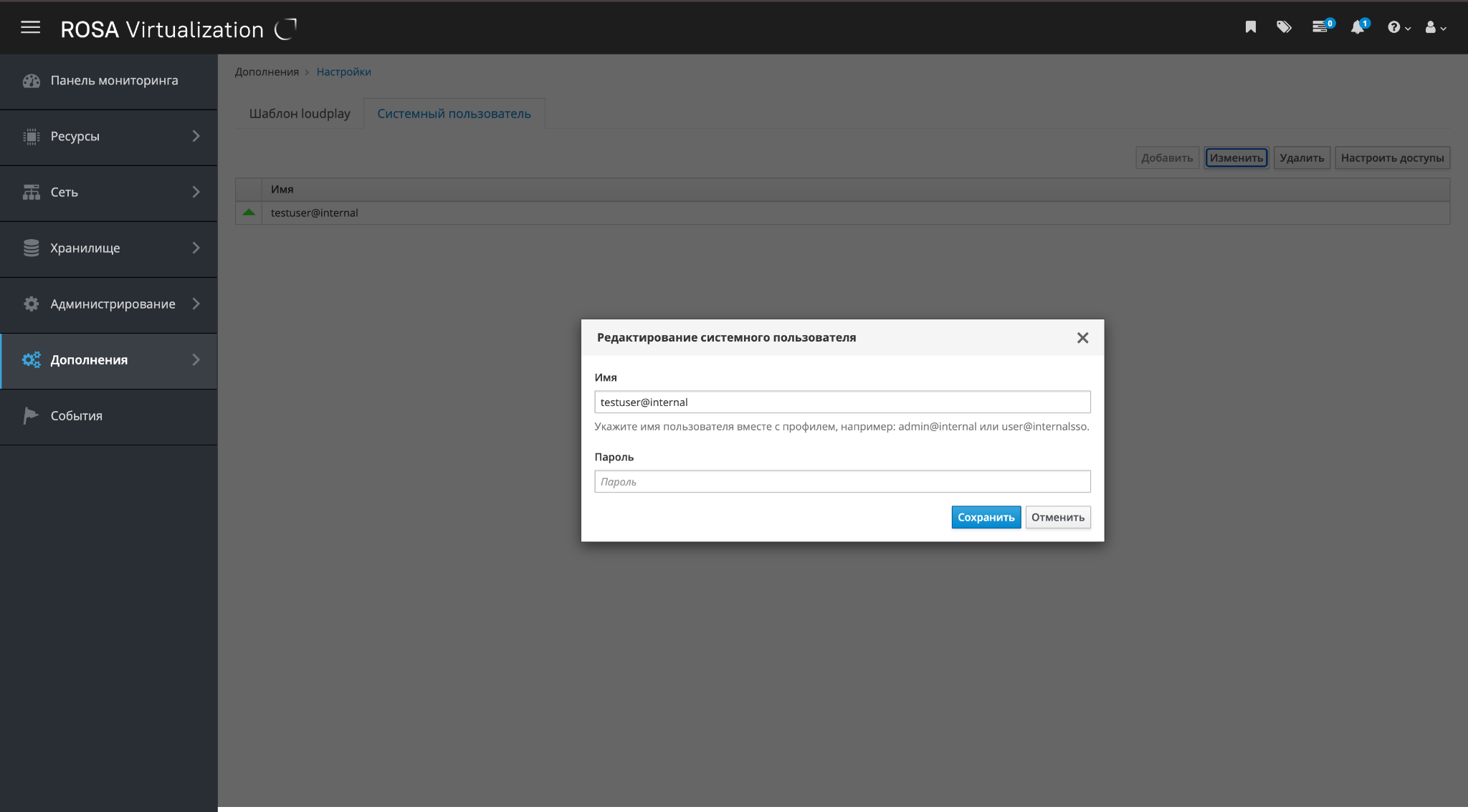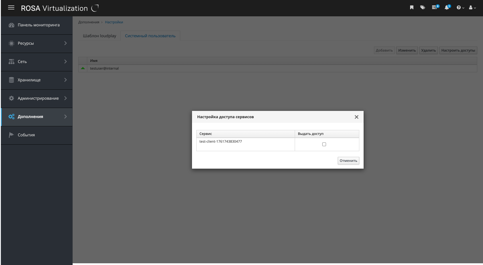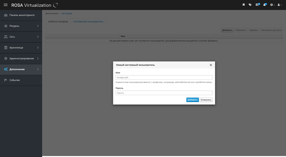 Модуль "Системный пользователь" является частью интерфейса РОСА Виртуализация и устанавливается из отдельного дистрибутива.
