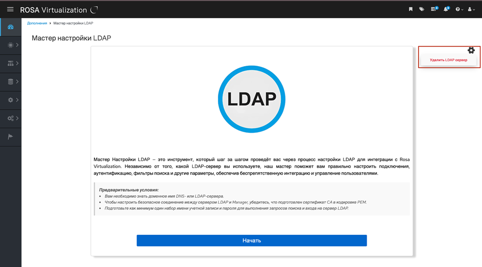 Для начала работы с "Мастером настройки LDAP" нужно нажать на кнопку Начать и выполнить следующие действия: