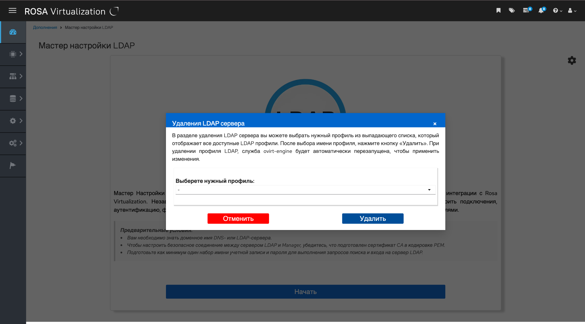 По завершении удаления профиля LDAP служба ovirt-engine будет автоматически перезапущена, чтобы применить изменения в Cистеме. Этот шаг гарантирует, что все изменения, связанные с удалением профиля LDAP, будут правильно интегрированы в Cистему.