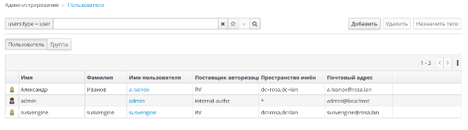На странице "Администрирование → Пользователи" отображается список пользователей, авторизованных для работы с РОСА Виртуализация (рисунок 109).