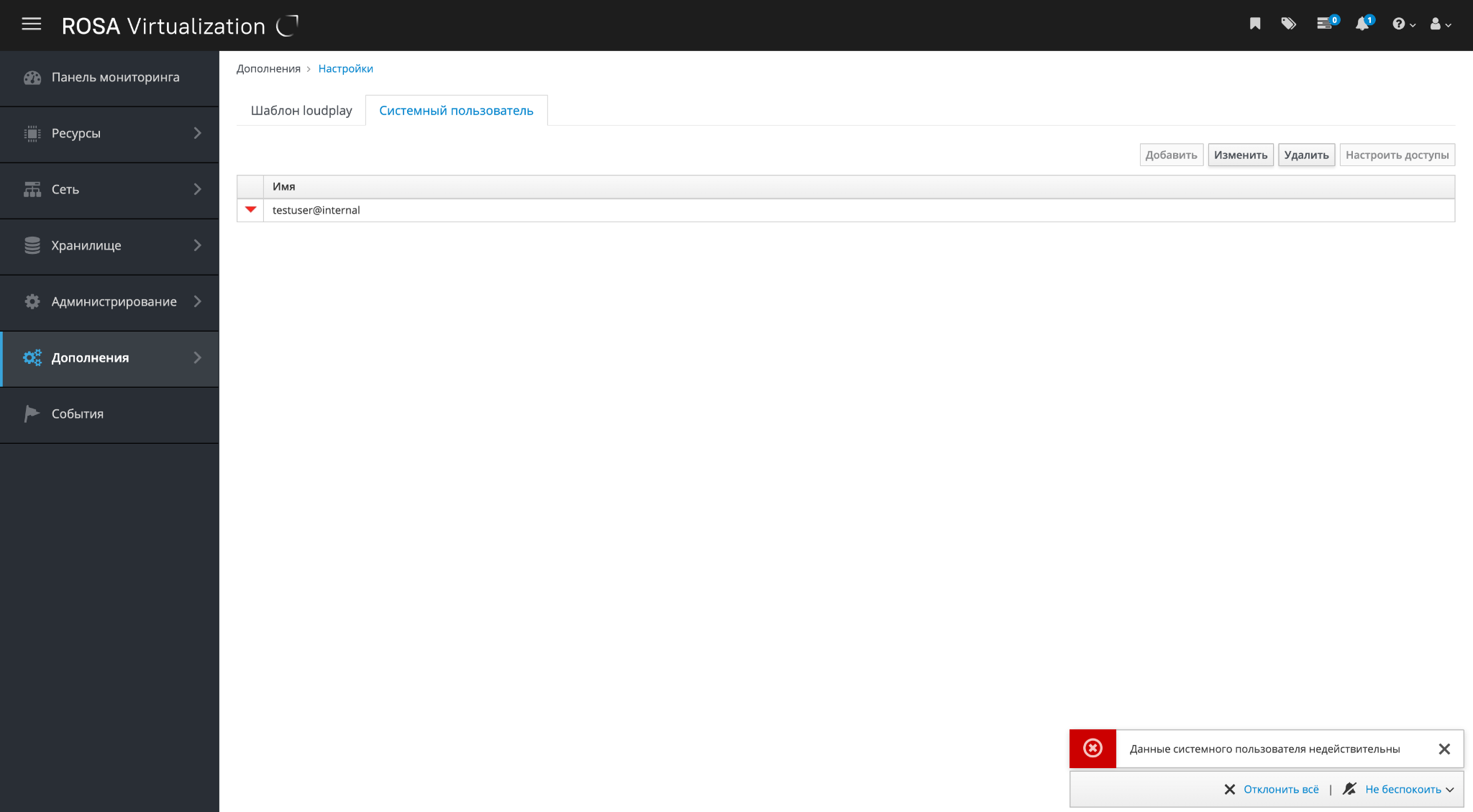 Если данные становятся невалидными, в правом нижнем углу интерфейса отображается уведомление о необходимости обновить информацию системного пользователя.