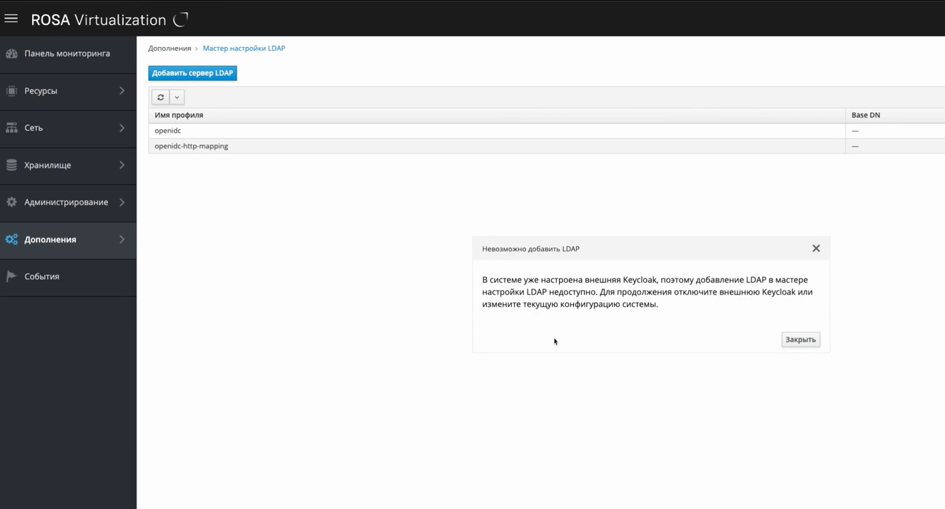 В режиме интеграции подключение служб каталогов к СУСВ не поддерживается (рисунок 163), поэтому необходимо использовать функционал федерации внешних баз данных пользователей Keycloak для взаимодействия со службами каталогов.