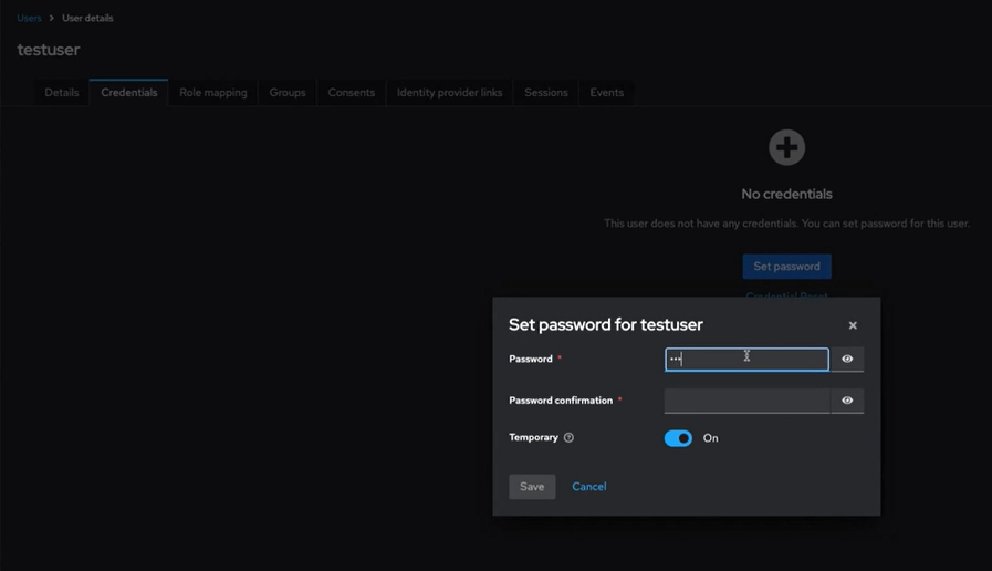 Во вкладке "Users/Credentials" задать пользователю пароль нажатием кнопки Set password. Включенный переключатель Temporary указывает, что при первом входе пользователю необходимо будет изменить пароль (рисунок 167). Ввод подтвердить нажатием кнопки Save.