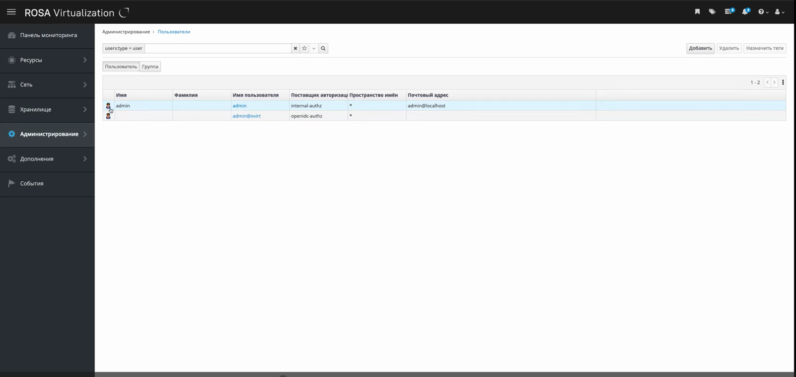 - Идентифицироваться на портале администрирования с учетной записью, имеющей достаточные права для управления пользователями (по умолчанию admin@ovirt).