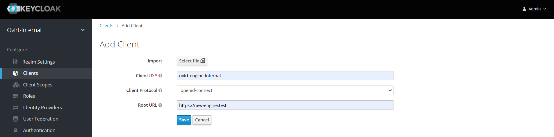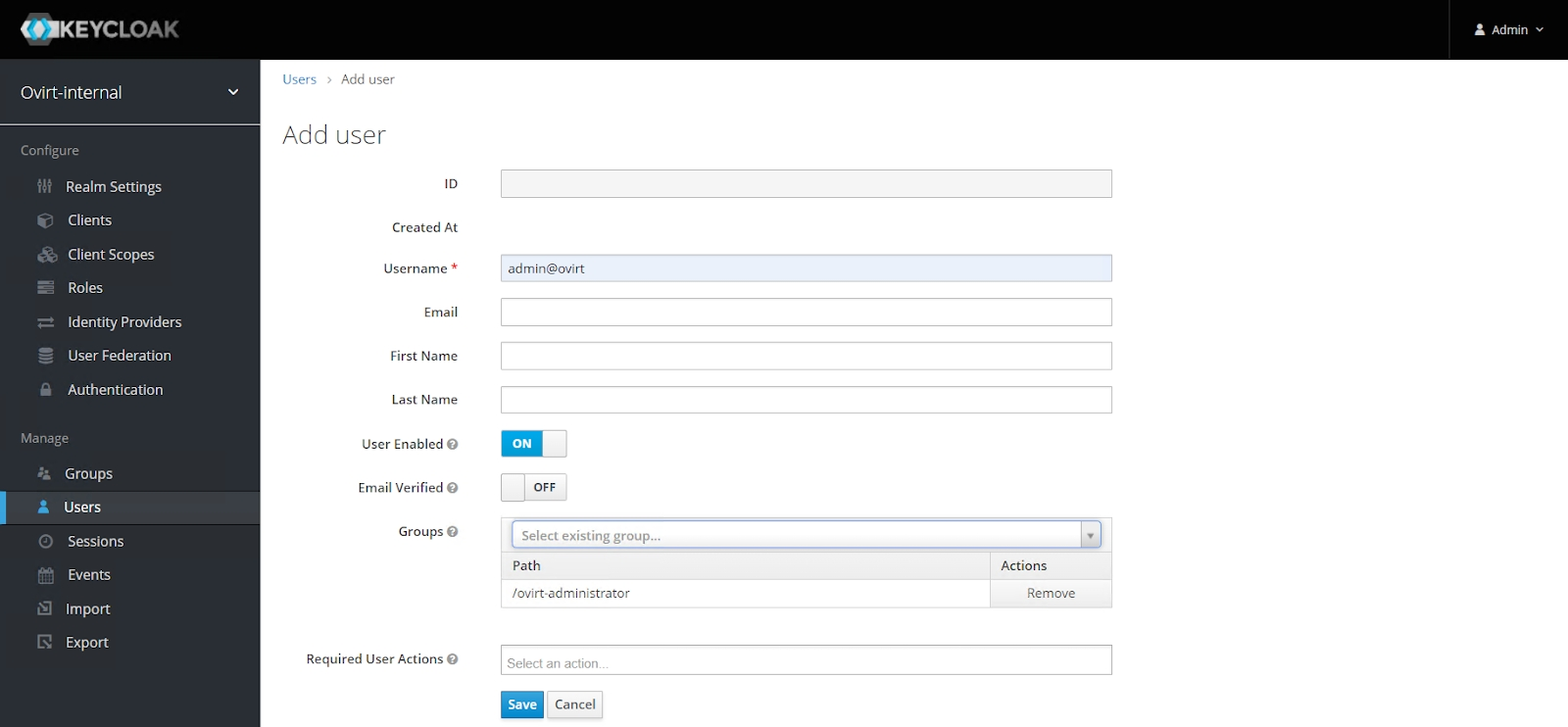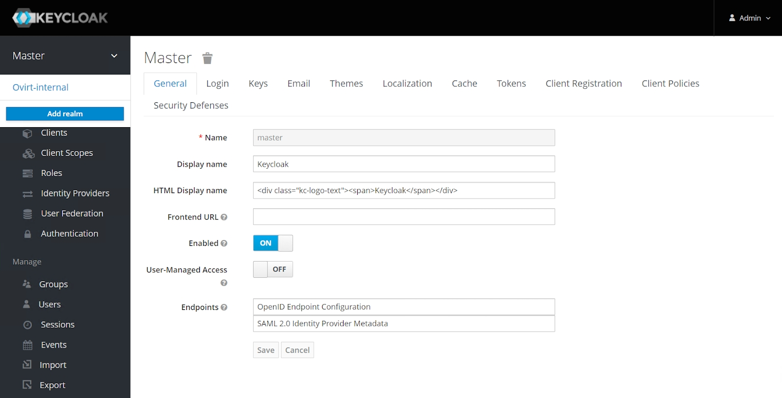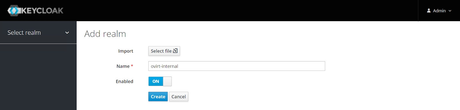 Add realm(рисунок 123). Задать имя"ovirt-internal"для нового realm. Дальнейшая настройка будет производиться в нем (рисунок 124).