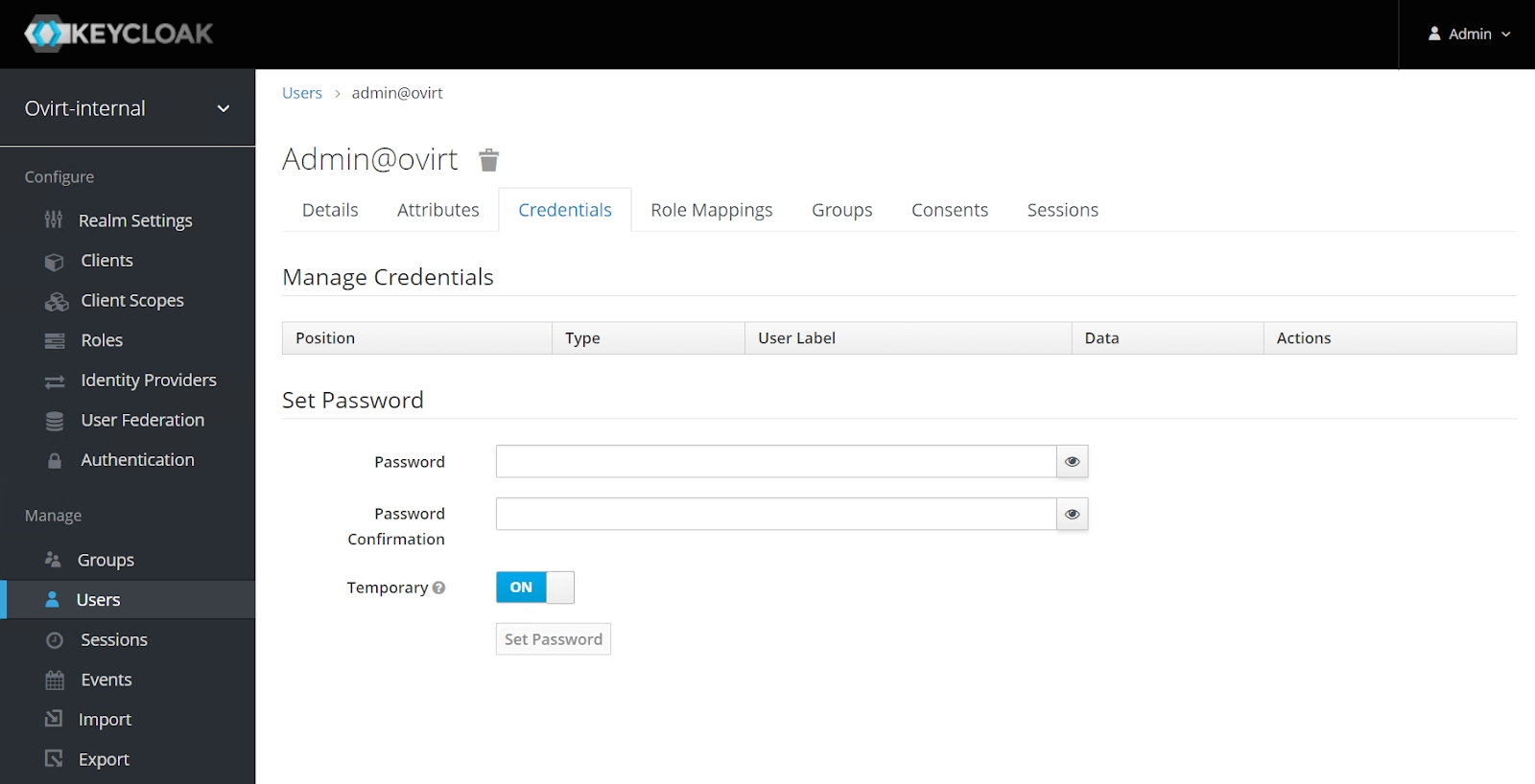- во вкладке "Users/Credentials" задать пользователю пароль нажатием кнопки