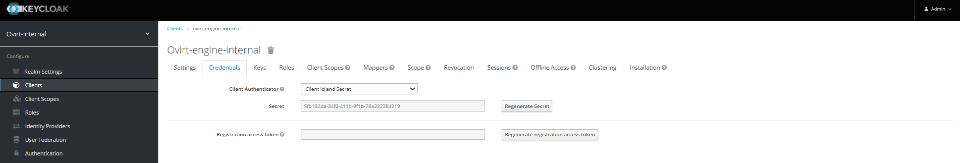 Необходимо обратить внимание, что на вкладке "Credential" раздела "Clients" размещена информация об аутентификации клиента в том числе поле Secret, которое может использоваться при дальнейшей настройке интеграции с сервисом (рисунок 138).
