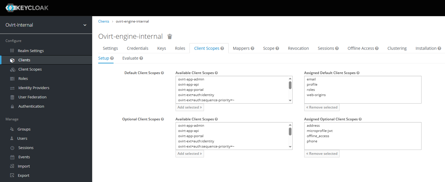 Необходимо перевести все доступные "Optional Client Scopes" из "Available Client Scopes" в "Assigned Optional Client Scopes" (рисунок 140).