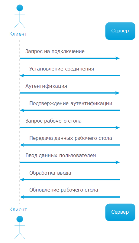 Схема взаимодействия между клиентом и сервером при использовании протокола RDP приведена на рисунке 6.
