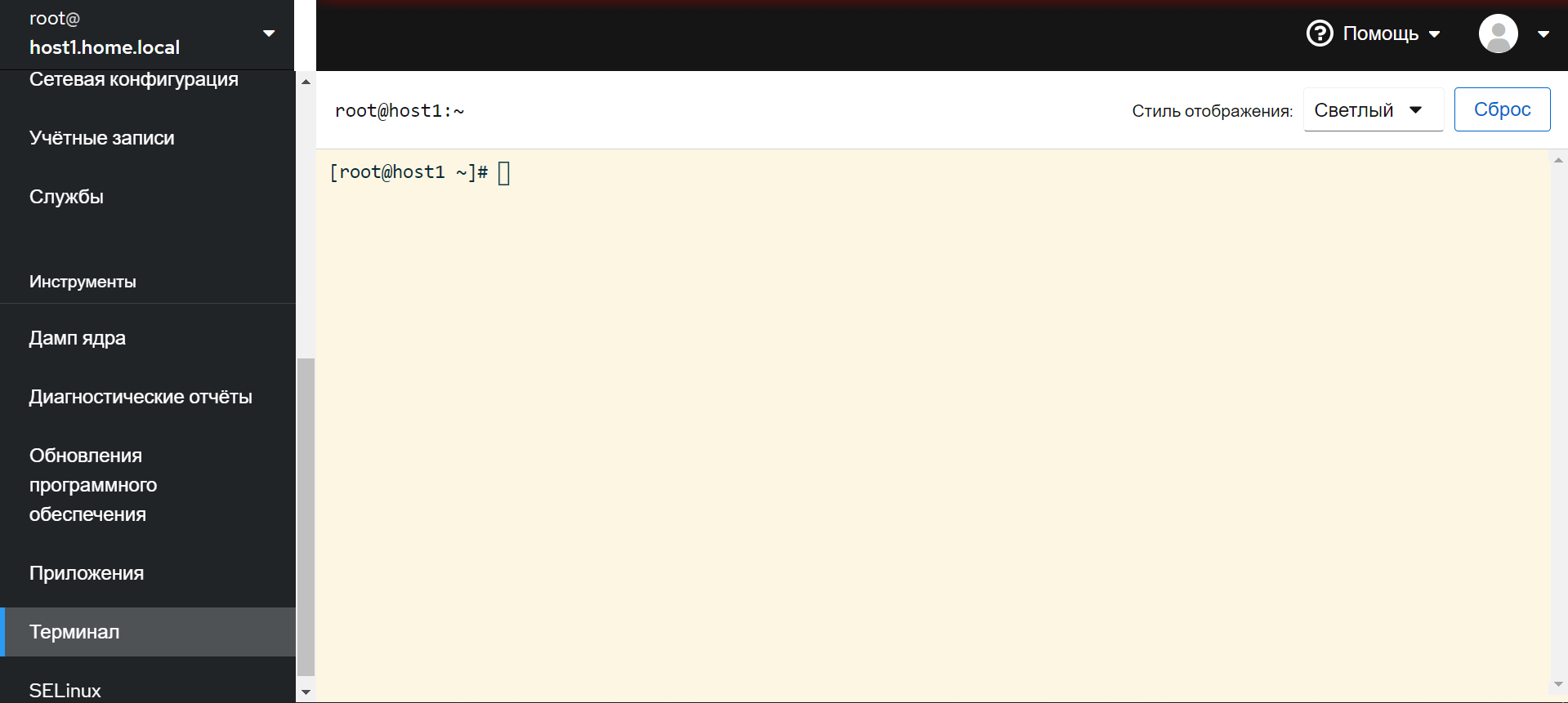 Примечание – Команды по настройке хоста, указанные в п. Редактирование файла /etc/hosts с именами хостов, используемых в системе, могут выполняться в консоли с доступом через SSH или в терминале, открытом в браузере веб-интерфейсе администрирования хоста