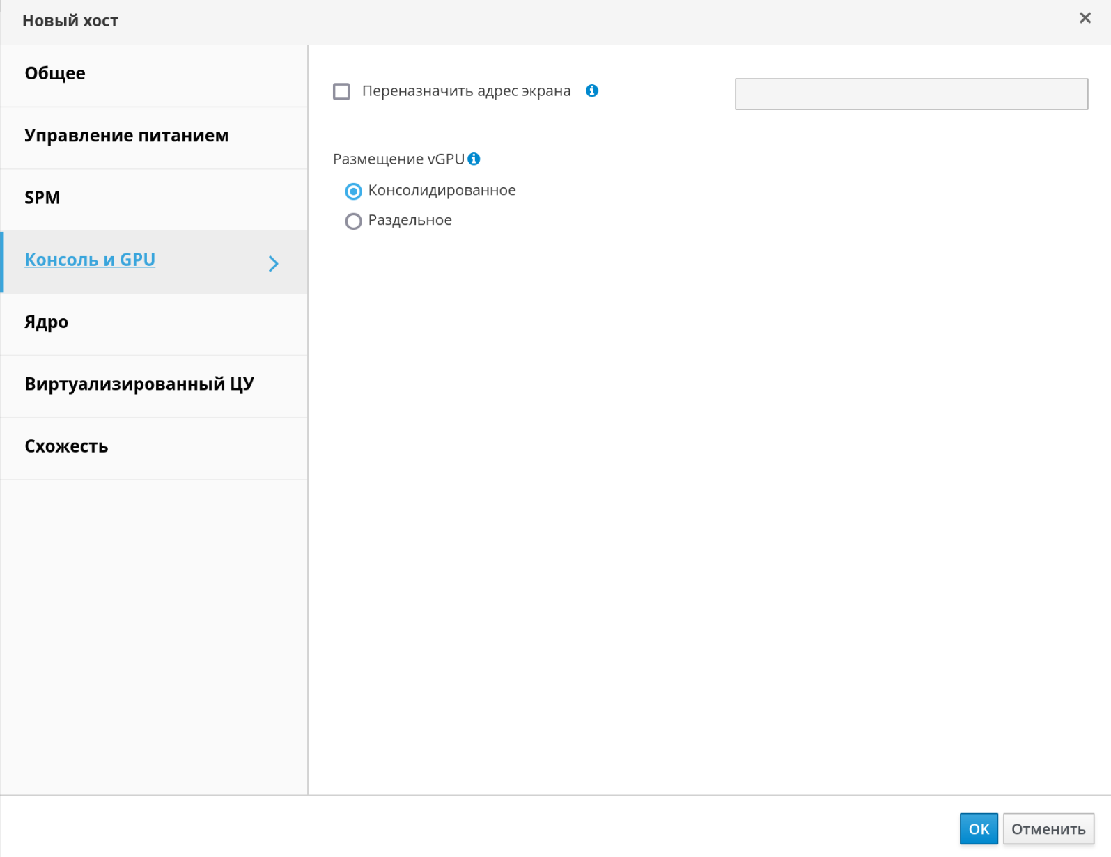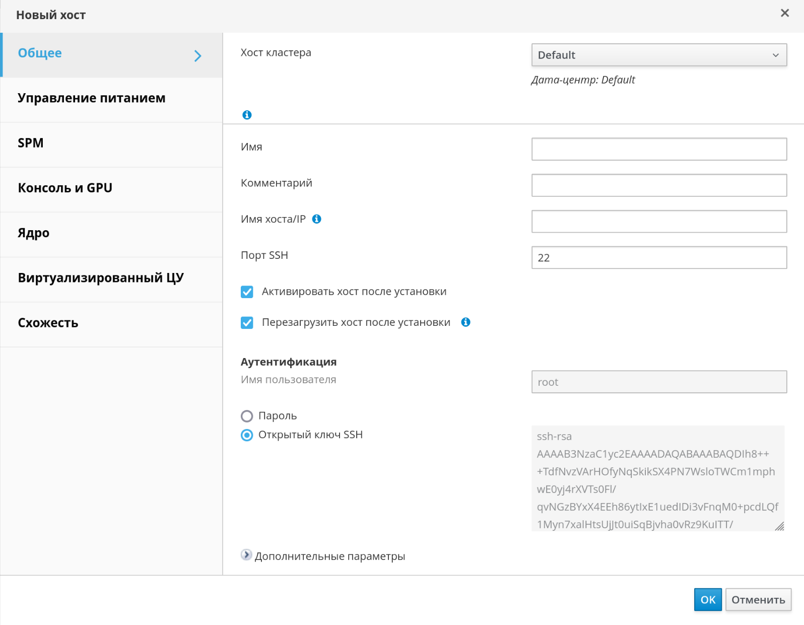 Общие "Параметры хоста" применяются во время изменения сведений о хосте под управлением гипервизора ROSA Virtualization или при добавлении хоста в виртуализированный ЦУ.