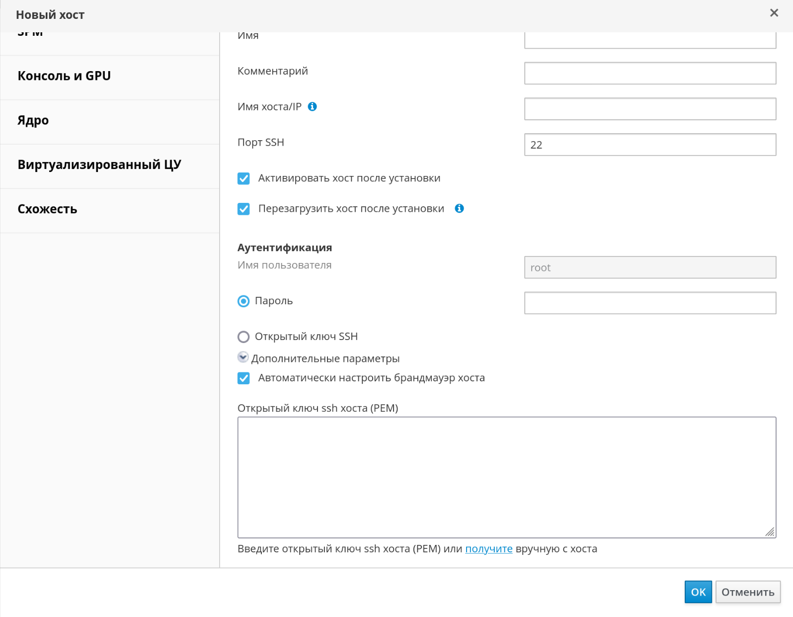 Примечание — Перед добавлением хоста в систему виртуализации ROSA Virtualization необходимо осуществить его предварительную настройку, аналогичную настройке хоста при первичной установке системы виртуализации (см. Руководство по установке "Платформа виртуализации "ROSA Virtualization" РСЮК.10102-02 92 01).