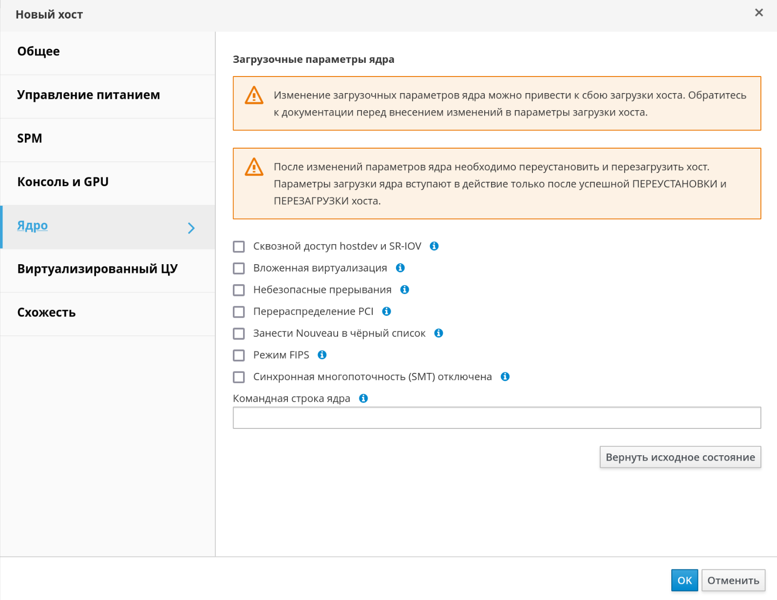 Примечание — Хост необходимо переустановить каждый раз при изменении (активации или деактивации) параметра "Интеграция Kdump".