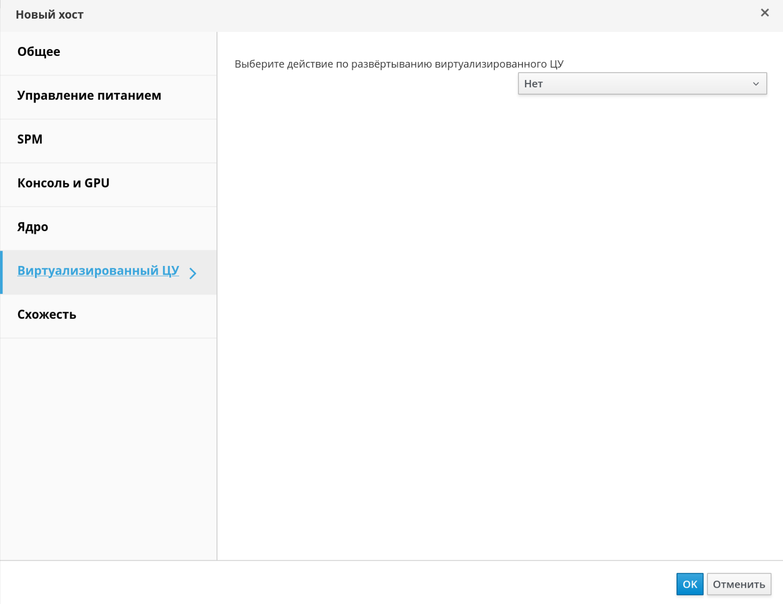 - Хост имеет процессор с поддержкой всех функций того типа виртуального ЦП, который был выбран при создании кластера, к которому принадлежит данный хост.