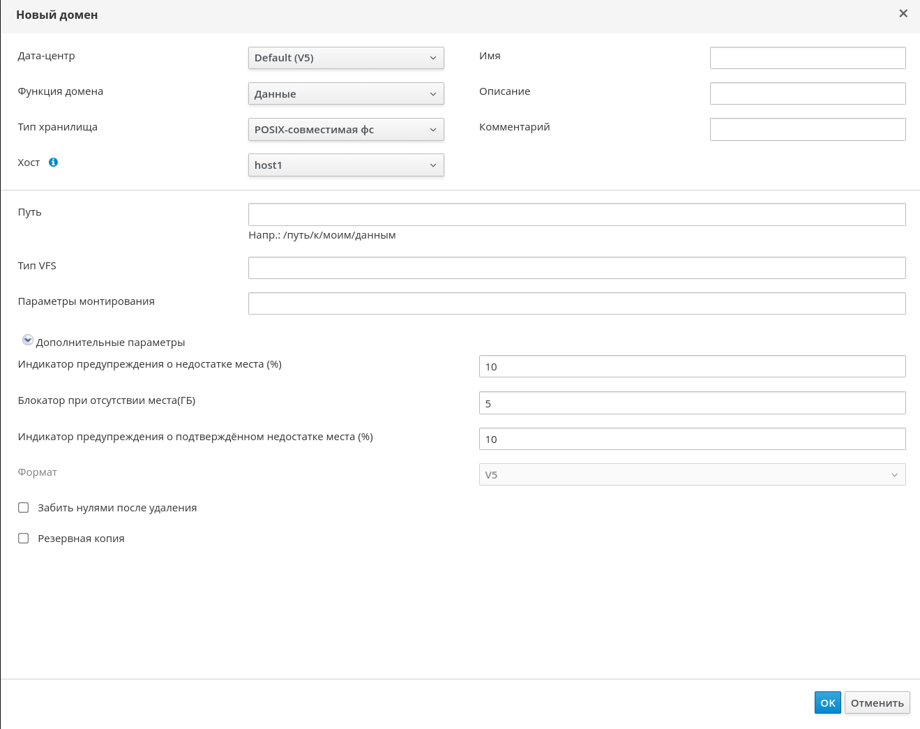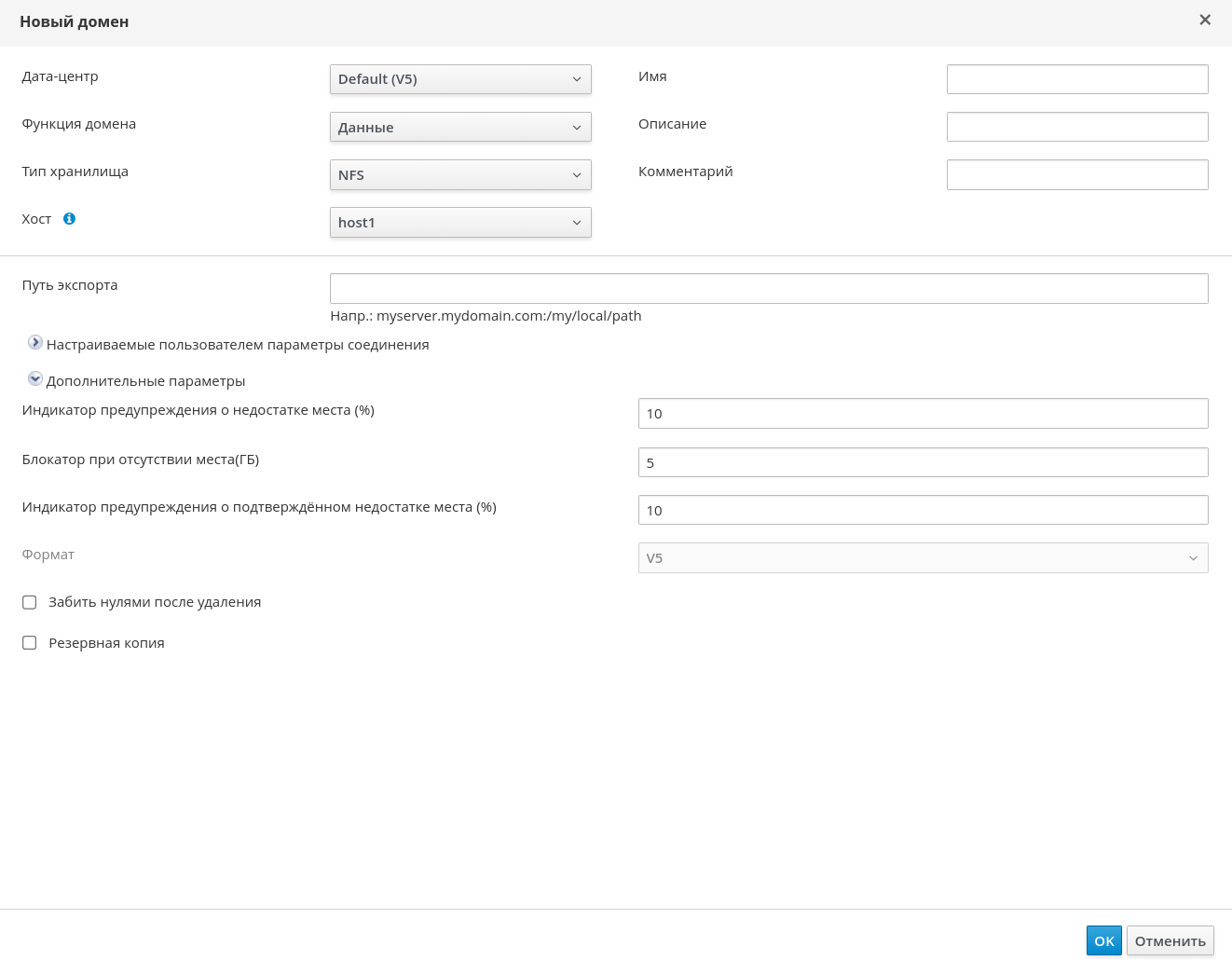 - Примите значения по умолчанию для списков "Дата-центр", "Функции домена", "Тип хранилища", "Формат" и "Хост".