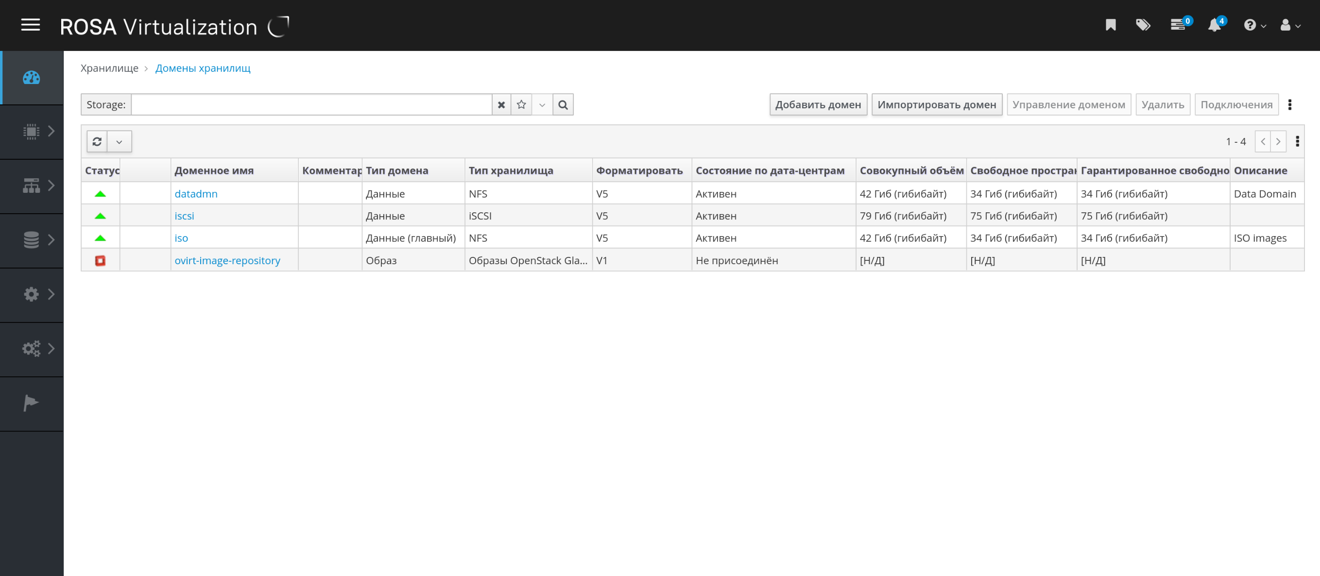 Для добавления доменов хранилищ необходим рабочий доступ на Портал администрирования, а также как минимум один подключённый хост со статусом "Запущен".