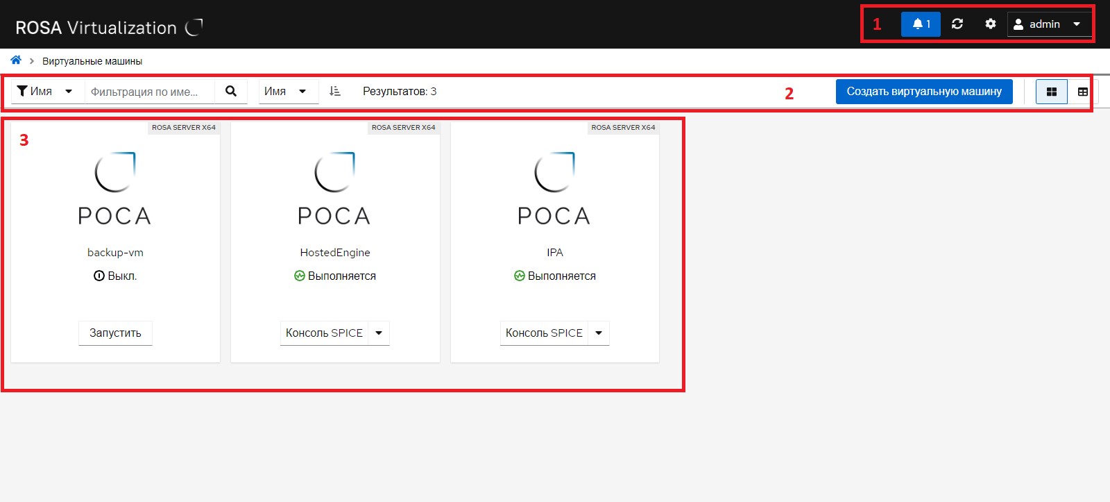 При запуске Портала ВМ открывается страница с главным интерфейсом программы, в котором можно выполнять общие задачи по работе с ВМ, изменять параметры входа в систему и просматривать сообщения. Интерфейс Портала ВМ представлен на рисунке 16.