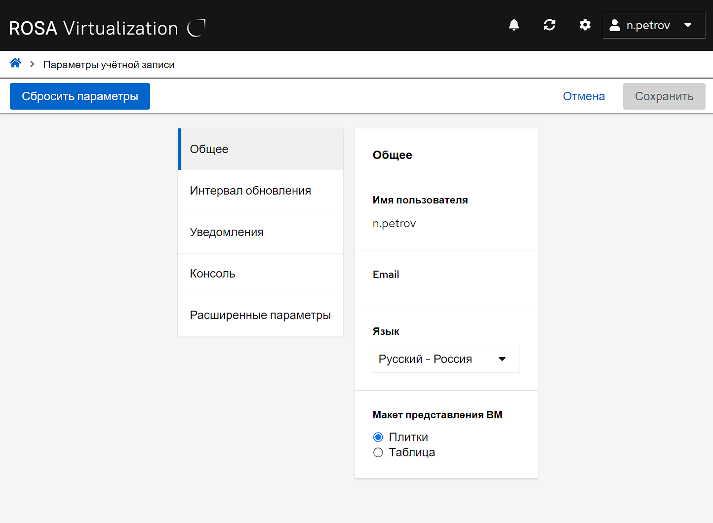 В секции формы "Общее" отображаются общие настройки, связанные с учетной записью пользователя.