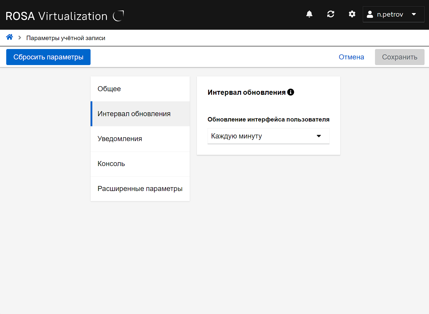 В секции "Интервал обновления" отображаются настройки интервала обновления интерфейса пользователя. По умолчанию интервал установлен на 1 мин (каждую минуту) (рисунок 19).