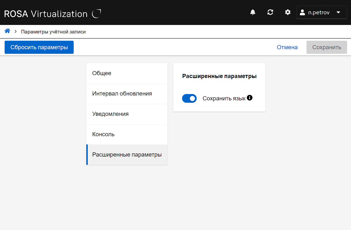 Опция "Сохранить язык" ‒ при включённом параметре выбранное значение языка будет сохранено на сервере.
