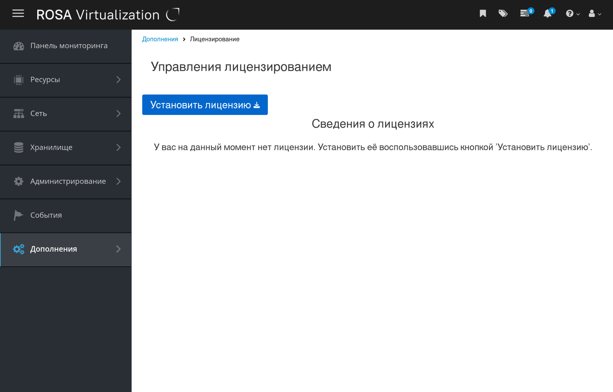 - Для активации лицензии ROSA Virtualization откройте меню "Дополнения" Портала администрирования и выберите секцию "Лицензирование".