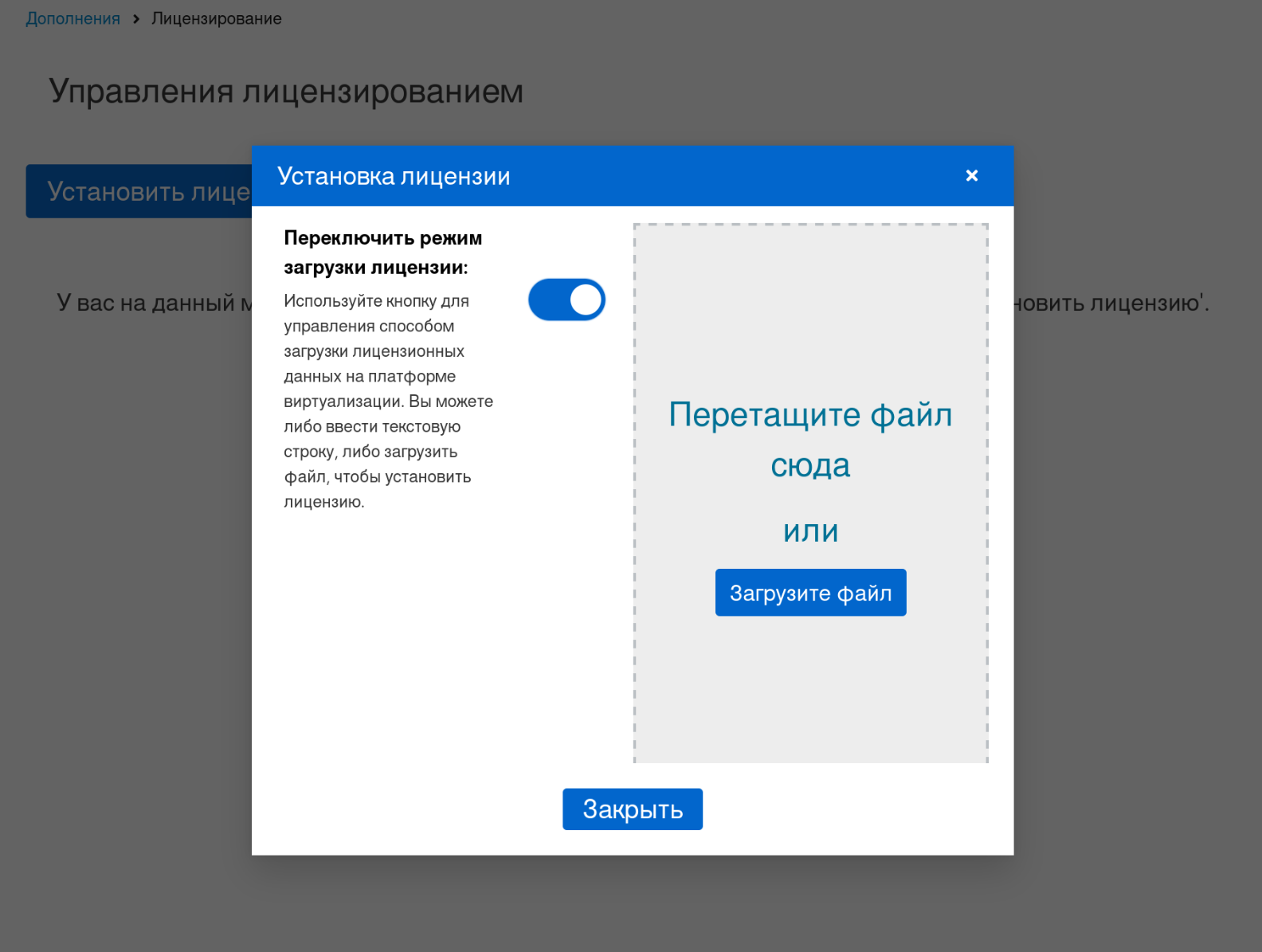 - Используйте кнопку переключения для изменения режима загрузки лицензии. При переключении кнопки вправо активируется режим загрузки файла. Также возможно перетащить файл в окно с помощью мыши (**рисунок **30).