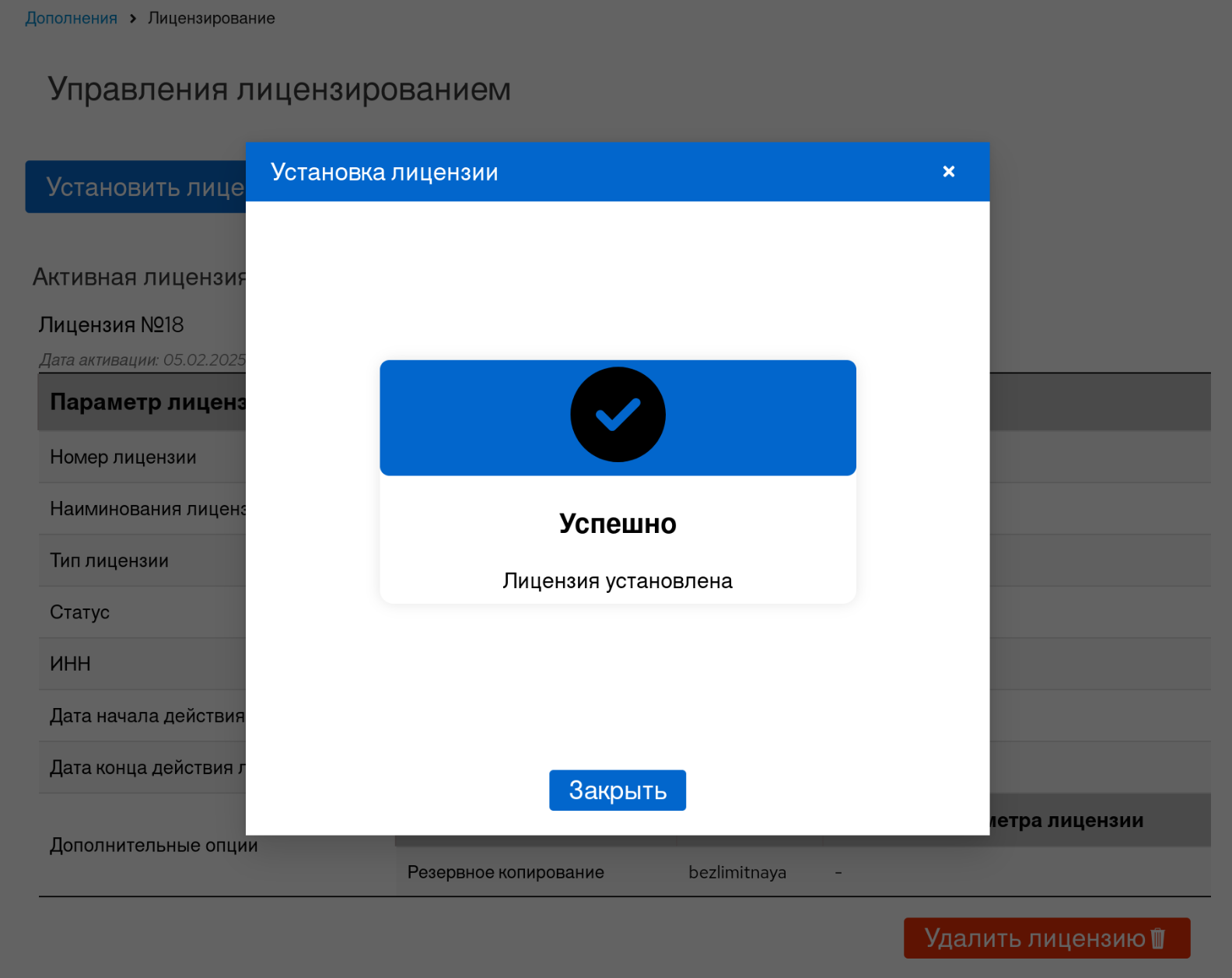 Рисунок 32 ‒ Подтверждение успешности загрузки лицензии
