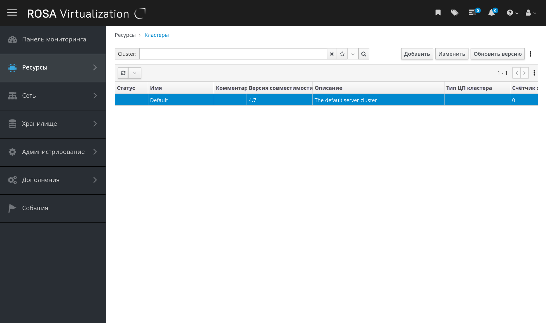 - Настройка кластера осуществляется в меню "Ресурсы → Кластеры" (рисунок 34).