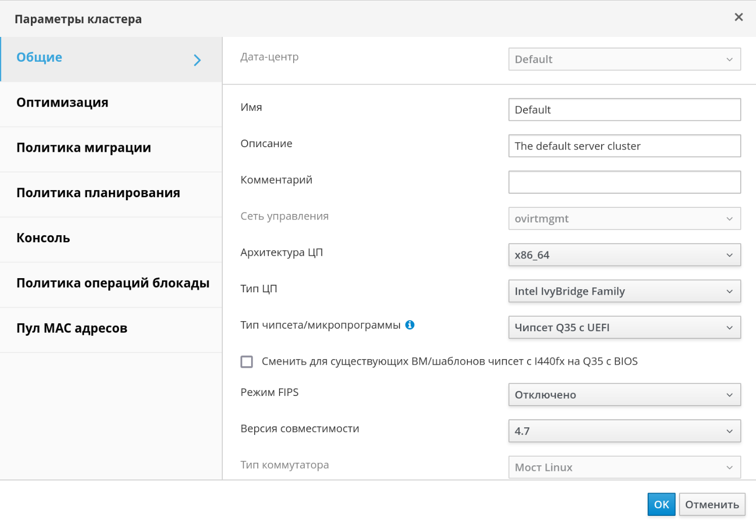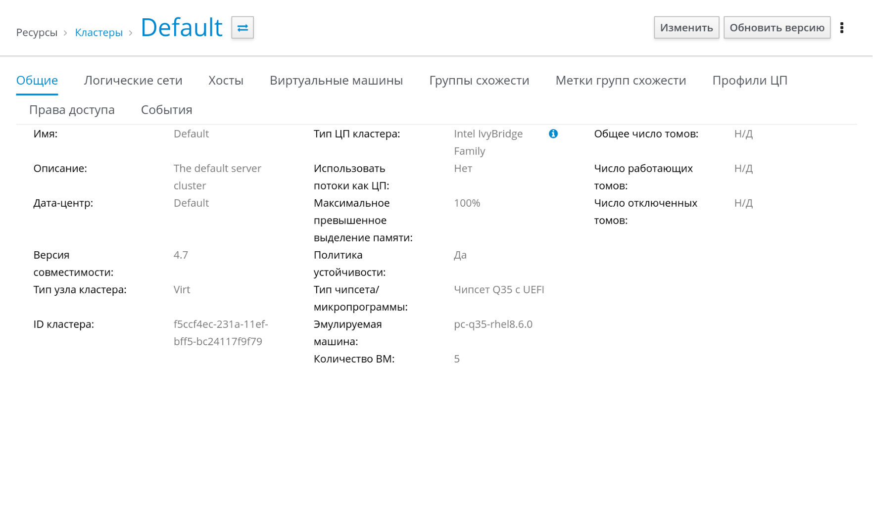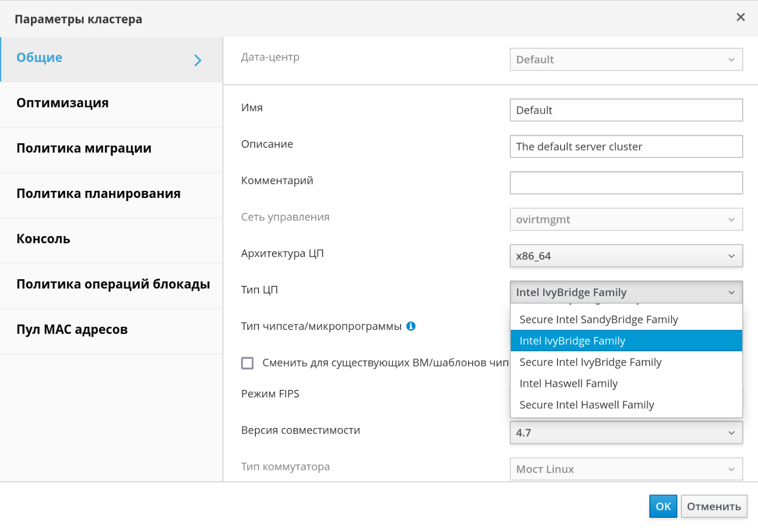 Например, если тип процессора в хостах с установленным гипервизором "Intel IvyBridge Family", то тип ЦП кластера должен быть также "Intel IvyBridge Family".