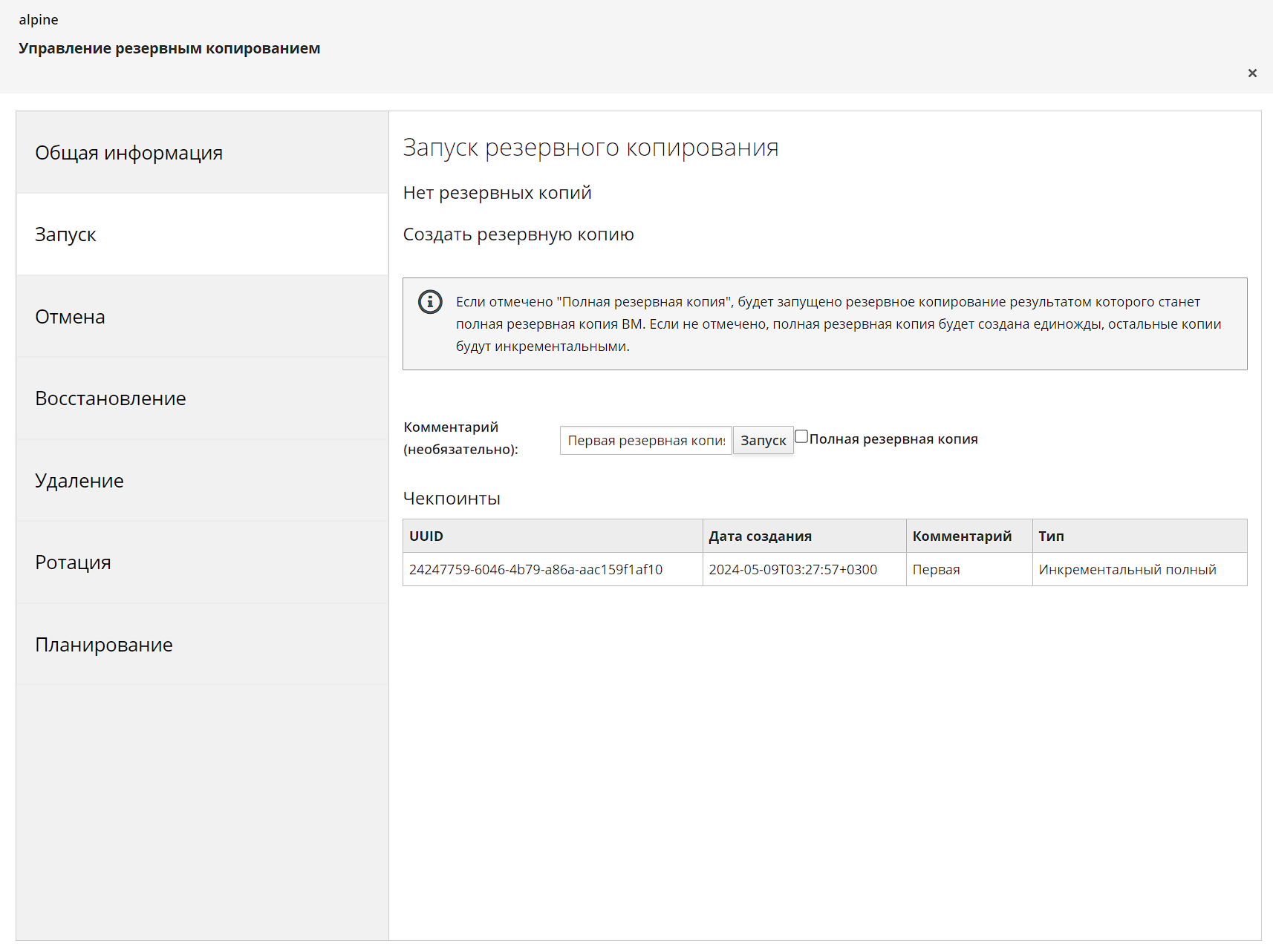 Рисунок 12 ‒ Секция запуска резервного копирования с созданным чек-пойнтом