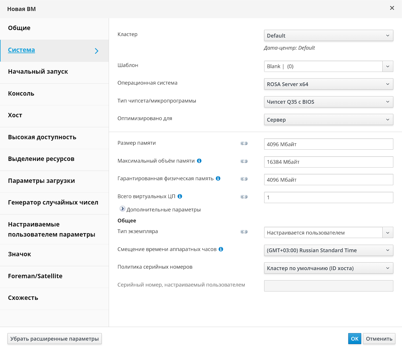 Рисунок 1 ‒ Общие параметры новой ВМ. Операционная система: ROSA Server x64, тип чипсета: Q35 c BIOS, оптимизировано для: серверРисунок 1 ‒ Общие параметры новой ВМ. Операционная система: ROSA Server x64, тип чипсета: Q35 c BIOS, оптимизировано для: сервер