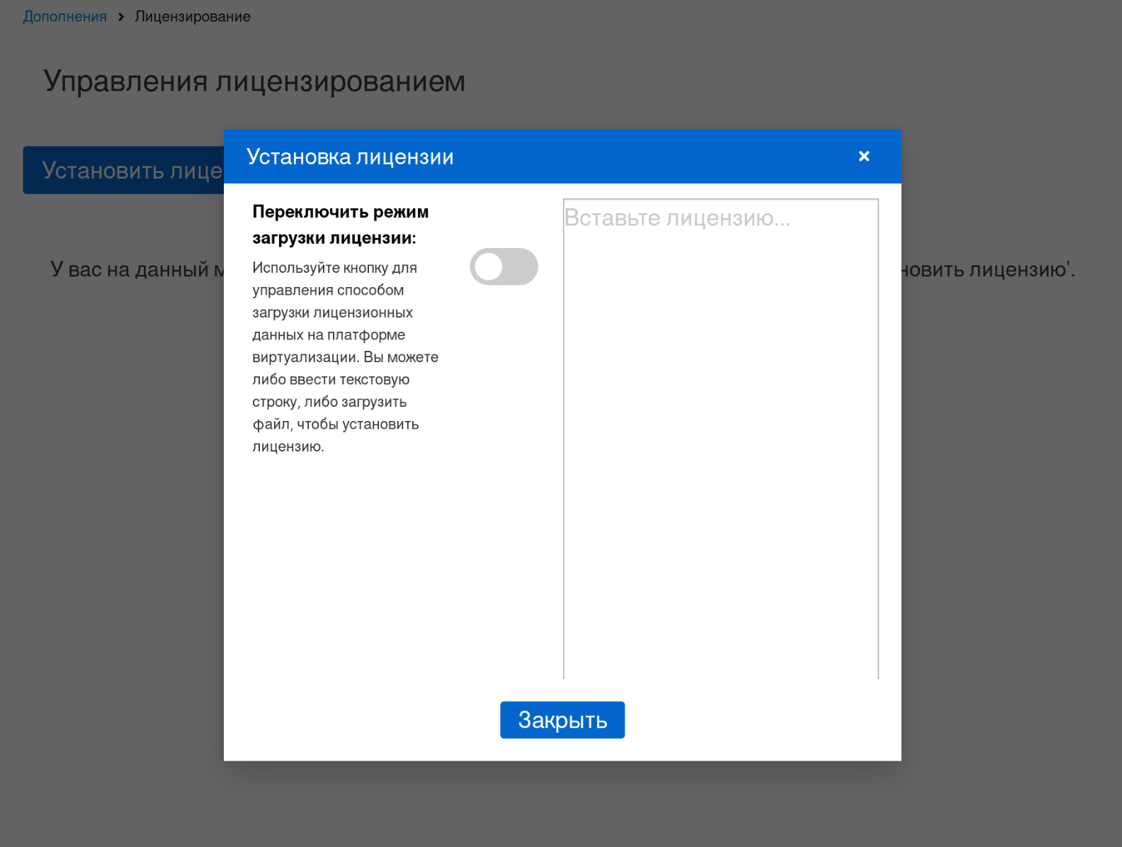 Если у вас есть лицензия (электронный ключ активации) в виде текстового файла, вы можете скопировать его содержимое в буфер обмена и вставить в поле ввода справа (секция "Вставить лицензию"). Затем нажмите на кнопку Загрузить и после валидации лицензии ‒ на кнопку Закрыть.