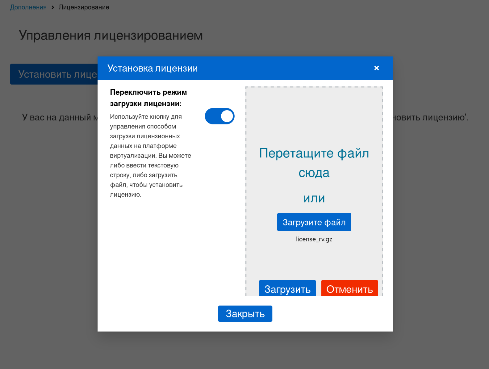 - Перетащите файл с лицензией (в примере ‒ license_rv.gz) в окно для загрузки или выберите файл с диска, используя файловый диалог (рисунок 73).