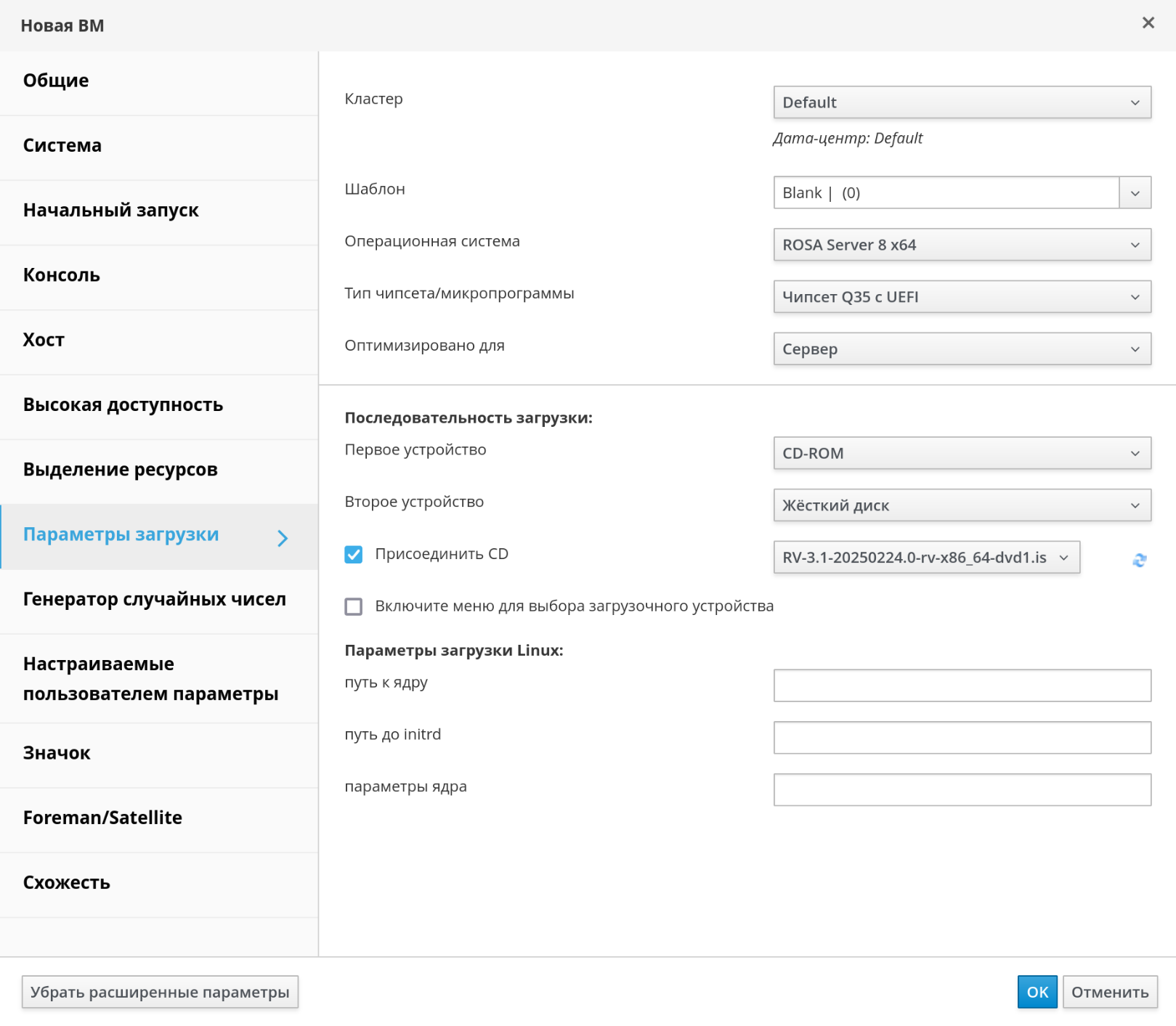 Установите флажок "Присоединить CD" и выберите из выпадающего списка образ с дистрибутивом (файл RV-3.1-20250224.0-rv-x86_64-dvd1.iso).