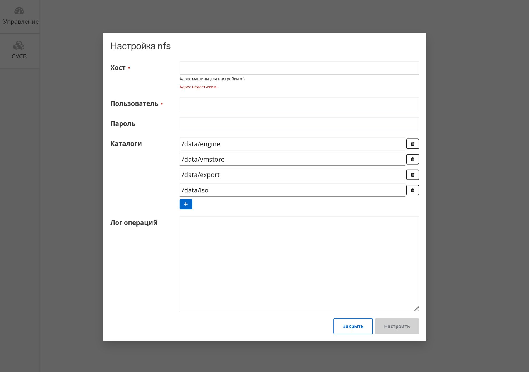 Рисунок 31 – Интерфейс окна для настройки хранилища NFS с указанным именем хоста, логином и лог выполненных действий
