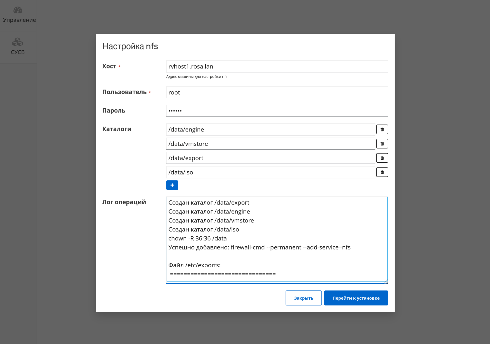 После завершения настройки хранилища NFS можно перейти к установке СУСВ (кнопка Перейти к установке) или закрыть форму (кнопка Закрыть).