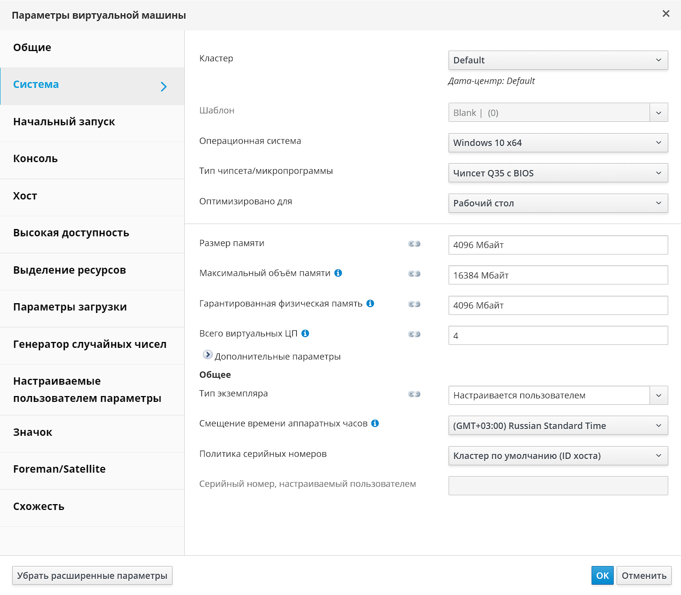 Примечание — Значения параметров в других вкладках и полях можно принять по умолчанию или изменить при необходимости (см. п. Параметры в окнах "Новая ВМ" и "Параметры виртуальной машины").