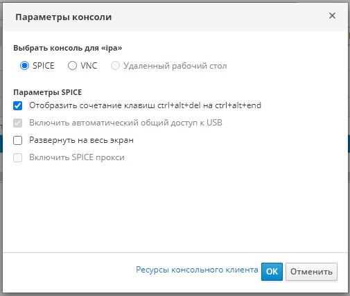 Если этот параметр не отмечен, устройства USB будут подключены к клиентской машине вместо гостевой ВМ. В этом случае, чтобы использовать устройства USB в гостевой ВМ, включите этот параметр в меню клиента SPICE вручную.