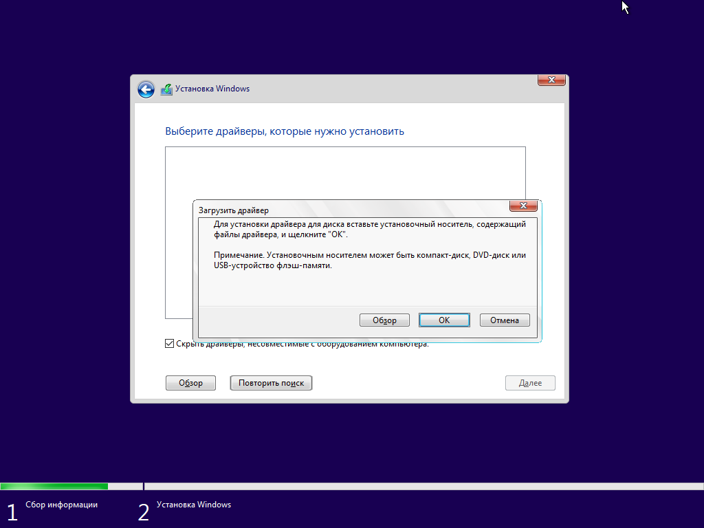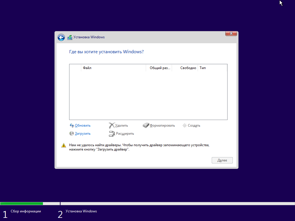 - Осуществляйте процесс установки ОС до этапа выбора устройства хранения (инсталлятор Cистемы не сможет определить диск). В верхней части экрана будет отображен заголовок "Где вы хотите установить Windows?" (рисунок 18).