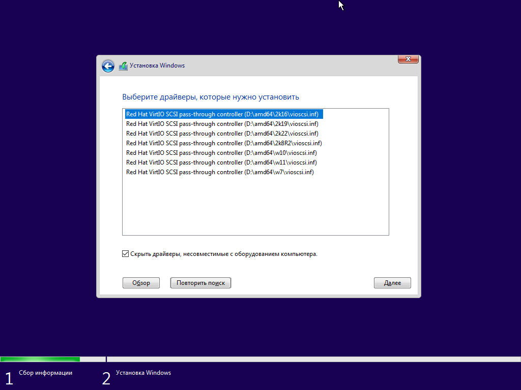 - В консоли ВМ установите драйверы VirtIO для системного виртуального диска. На экране инсталлятора "Выберите драйверы, которые нужно установить" нажмите