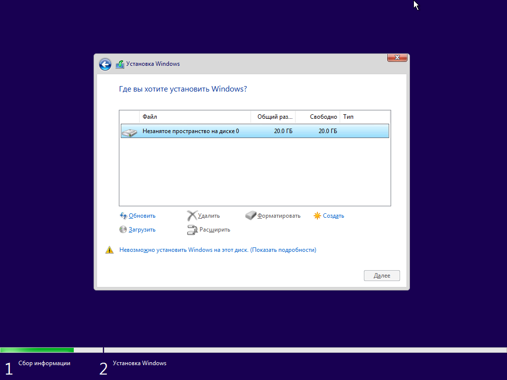 - В консоли ВМ на экране "Где вы хотите установить Windows?" нажмите Обновить. В форме со списком доступных дисков появится диск с незанятым дисковым пространством (рисунок 22).