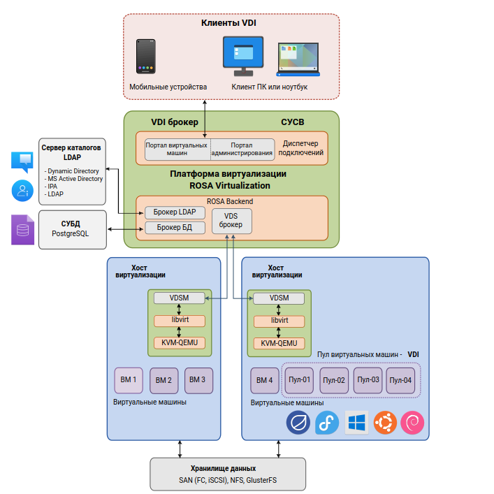 Взаимодействие клиента VDI с платформой виртуализации ROSA Virtualization осуществляется с помощью брокера VDI, в роли которого выступает СУСВ (Система управления средой виртуализации).